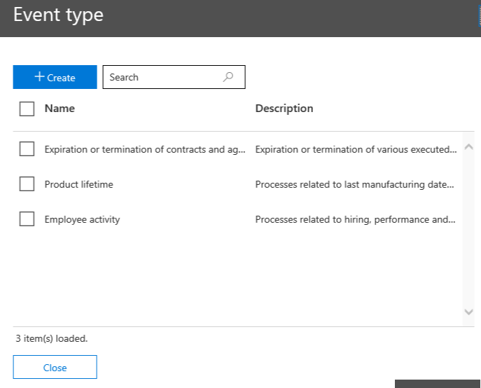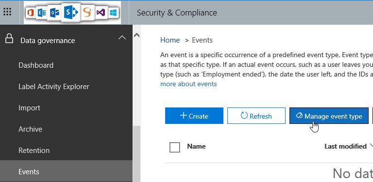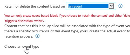 - Then you have to define the event which will trigger the retention policy – if you need you will be able to create a new event (you will be able to manage these by accessing the Data Governance\Events\Manage event type)