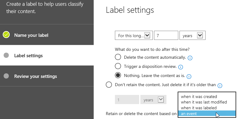 Now, with the Office 365 Security and Compliance portal you can also define the data retention based on event and not only on time/age.