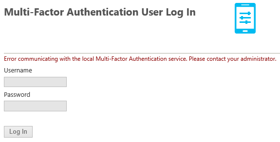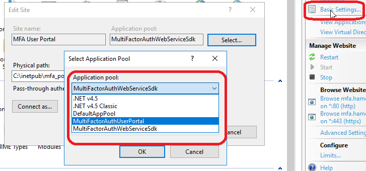 - After the upgrade or install is completed, check the IIS Application Pool associated with the User portal as it may have been changed to use the Web Service SDK application pool. If so you will get the following error “Error communicating with the local Multi-Factor Authentication service. Please contact your administrator.”; you just need to change the application pool using the IIS console by using the Basic Settings options for the user portal web site and change back the user portal application pool