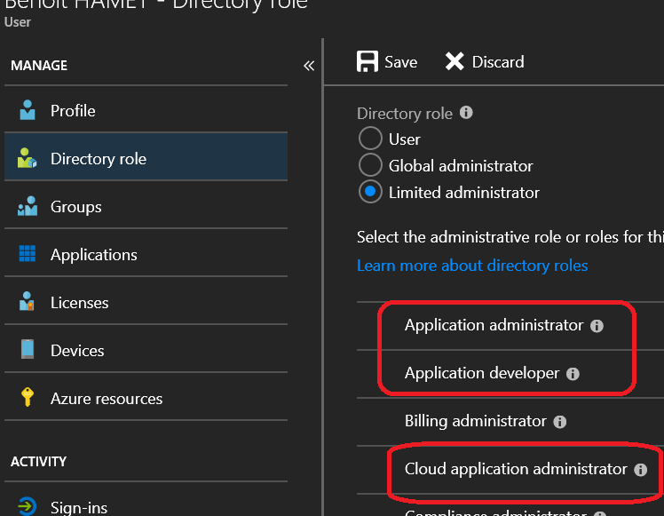 - Application Administrator: This role provides the ability to manage all applications in the directory, including registrations, SSO settings, user and group assignments and licensing, Application Proxy settings, and consent. It does not grant the ability to manage conditional access.