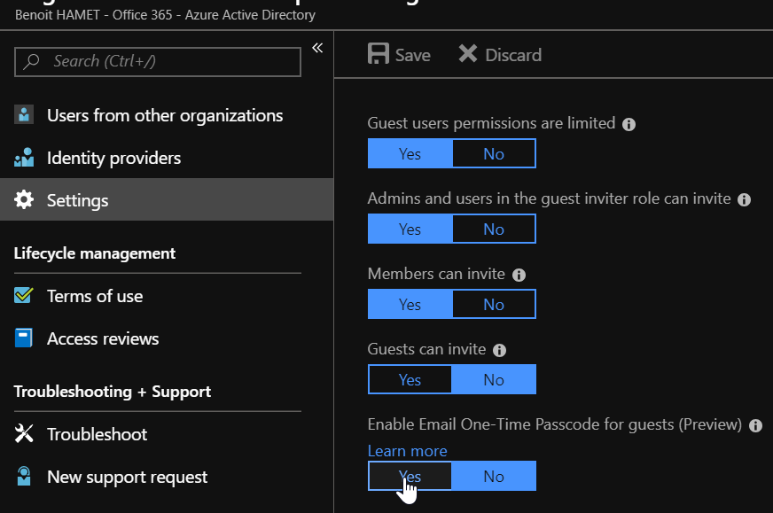 Then access the Settings configuration blade and enable the new ‘Email One-Time Password for guest’ option
