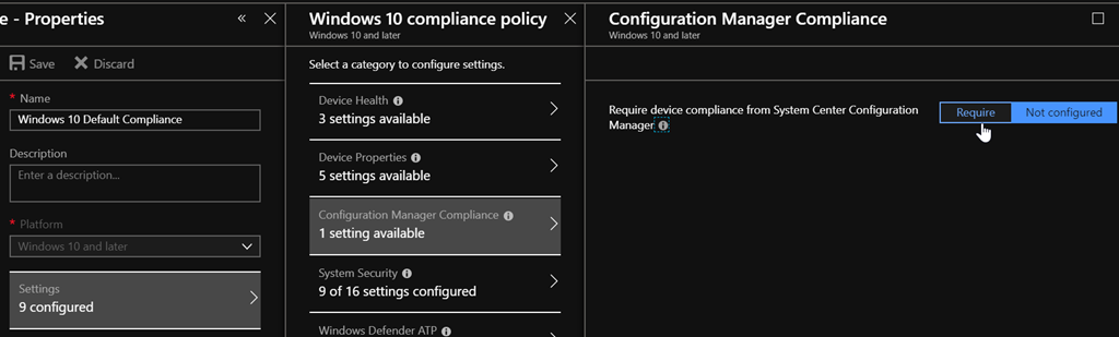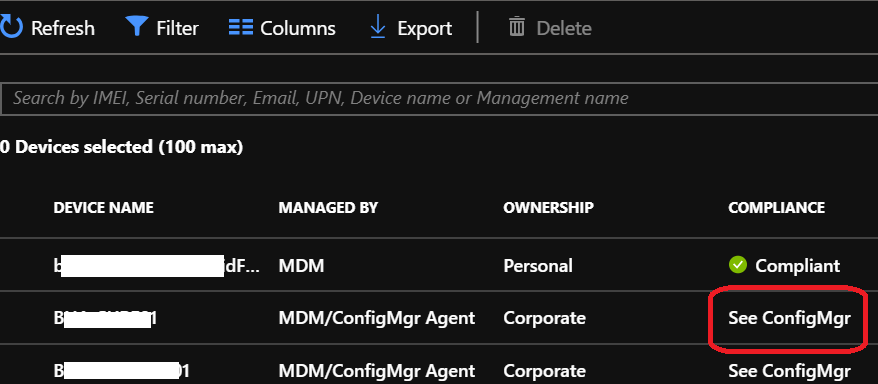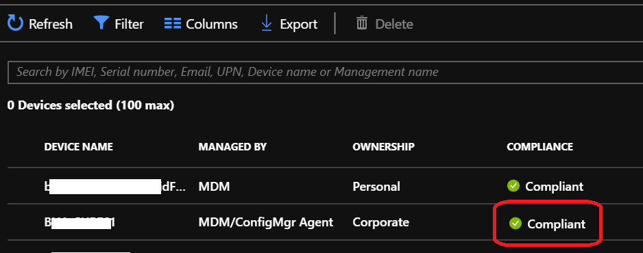Then once the policy have been applied/refreshed, the Compliance state for the device will change from See ConfigMgr to Compliant or Not Compliant based on the compliance state being sent by SCCM.