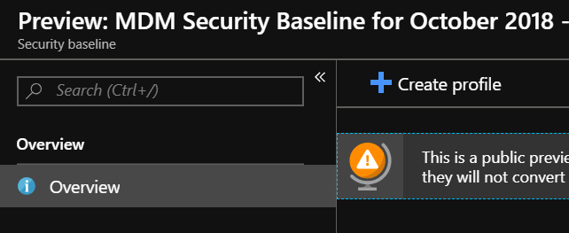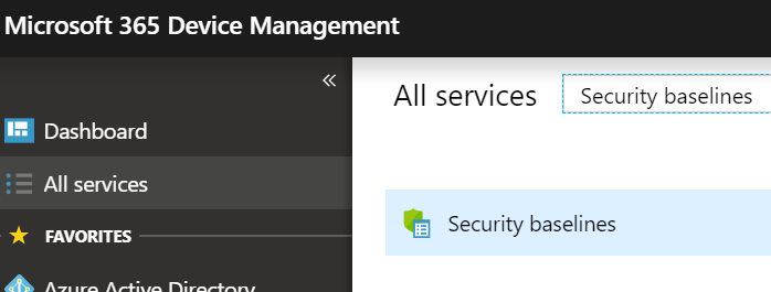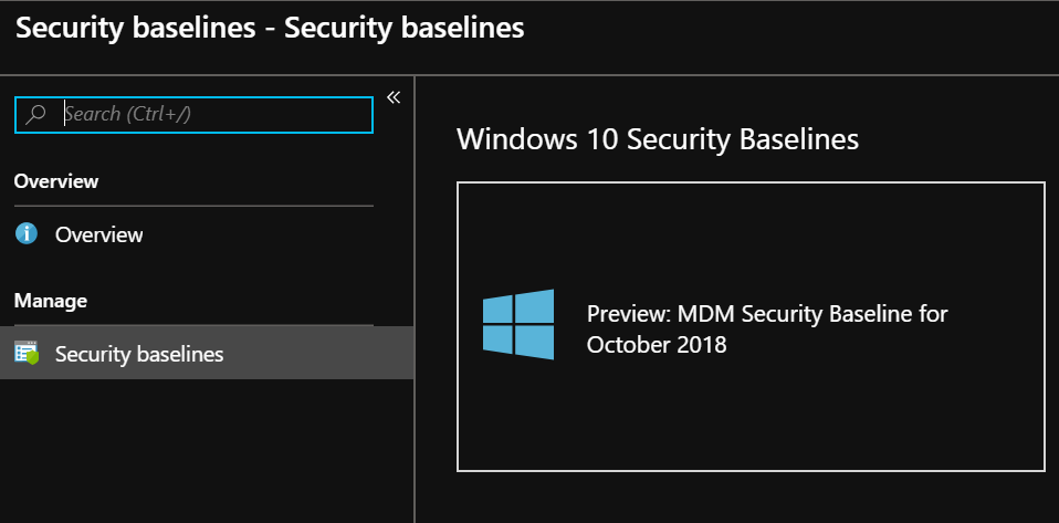 You can start using it either by searching for Security Baselines from your Azure portal, Office 365 mobile device management portal, or by accessing it through the direct URL (as the feature deployment is still in progress this may not yet be visible) https://ms.portal.azure.com/#blade/Microsoft_Intune_Workflows/SecurityBaselineMenu/securityBaselines