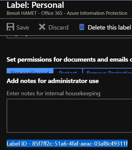 You can get the label ID by accessing the Labels blade and then select the label you want to gather the ID. The label ID value is displayed at the bottom of the blade