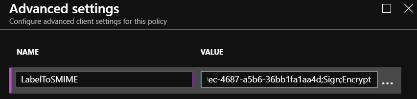 - Value: will be a combination of the label ID you want to use and the S/MIME configuration to apply, using the format <label ID>;<S/MIME protection>