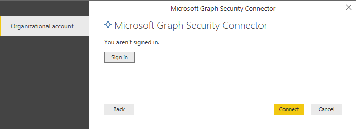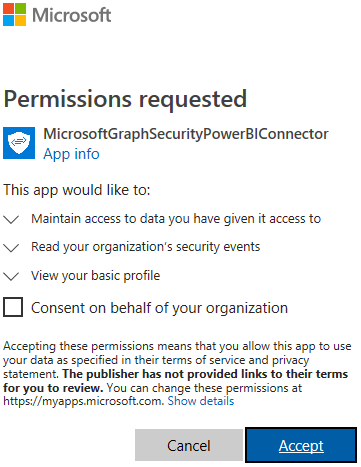 During the first login you will get prompted to grant the appropriate permission to the Graph Security API connector; if you are logging as global administration, it may be a good thing to check the box “Consent on behalf of your organization”.