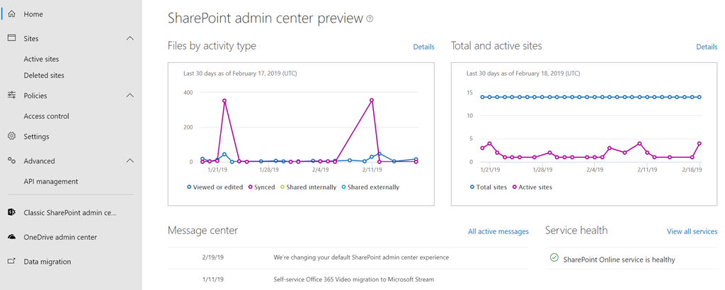 This new administration portal is now becoming the default SharePoint Online administration experience over the next few months, with tenant with 50 users or less being targeted first (expected roll out start schedule for March 2019).