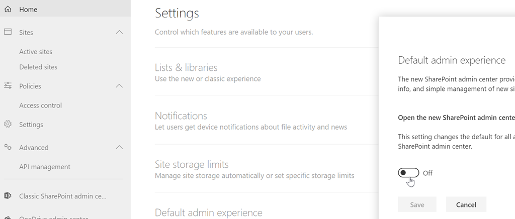 From there access the Settings option from the left menu and open the “Default admin experience”option to turn the toggle to Off