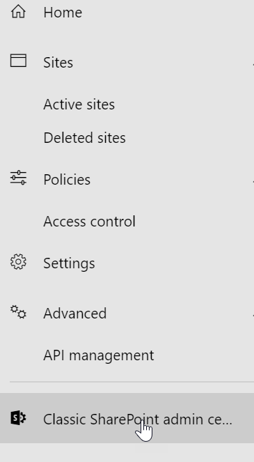 If you choose to keep on going with the new administration portal, you can at any time go back to the ‘old/legacy’ administration portal by using the Classic SharePoint admin experience option available on the left menu