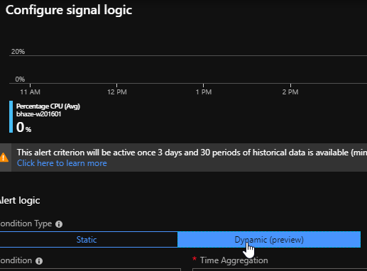With Dynamic Thresholds you no longer need to manually identify and set thresholds for alerts. The alert rule leverages advanced machine learning (ML) capabilities to learn metrics’ historical behavior, while identifying patterns and anomalies that indicate possible service issues.
