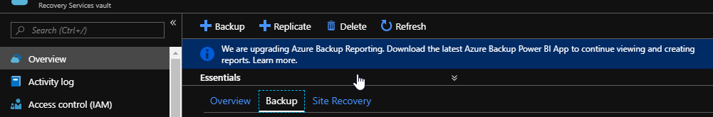If you use the Azure portal to access your Azure Recovery Vault backup reports you will start seeing a notification related to the Azure Backup Reporting upgrade which will start using PowerBi for the reports.