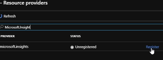 To register the Microsoft.Insight provider, connect to your Azure portal (https://portal.azure.com/) and reach out the Subscriptions configuration blade