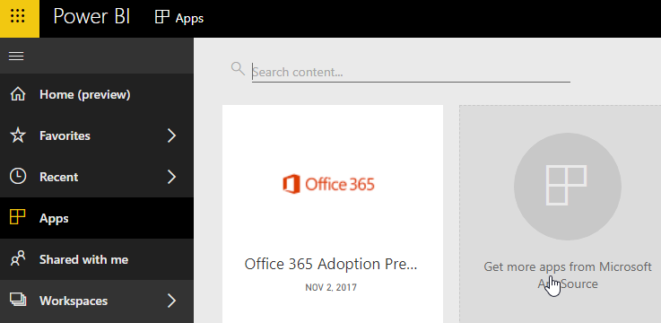Connect to PowerBi (https://powerbi.microsoft.com) and go to the Apps section and click on Get more apps from Microsoft AppSource