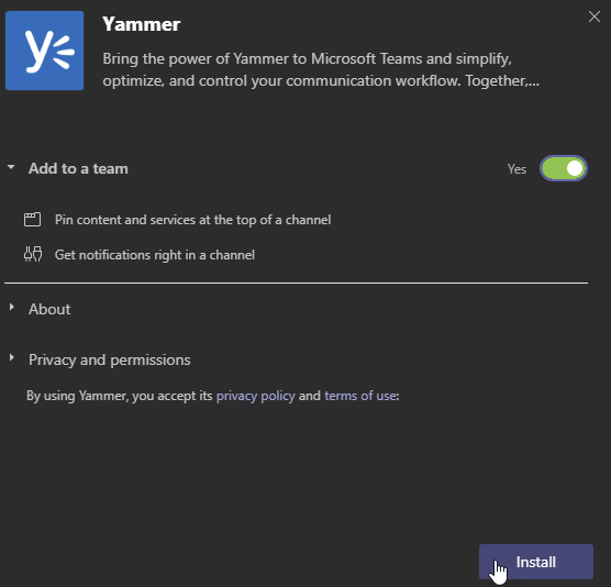 Then ensure the ‘Add to a Team’ option is set to Yes (default) – if set to No, you will not be able to install it – and click Install