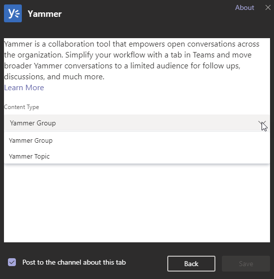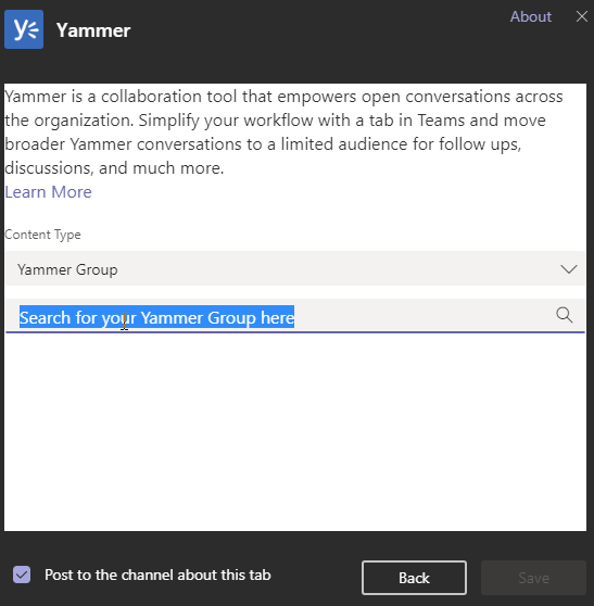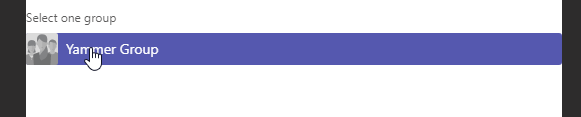 Then define which Yammer content type (Yammer Group or Yammer Topic) to push in your Teams as well as the Yammer Group – there is no drop down or prefilling, you need to search for the group