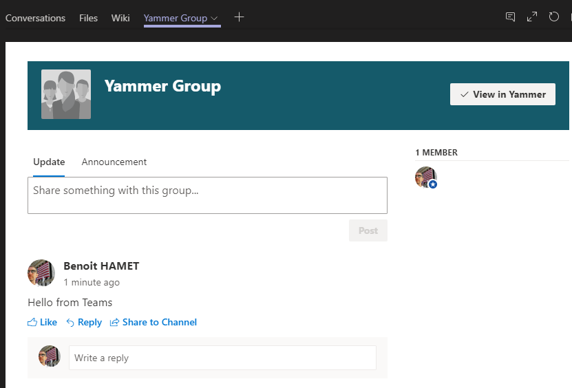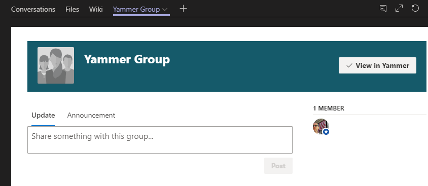 This is it, the Yammer group is now added to your Teams – you can at anytime use the View in Yammer button (top right) to go to Yammer
