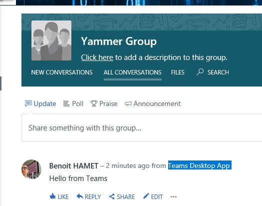And I have posted a message from Teams to the Yammer group, you can see it show ‘from Teams Desktop app’