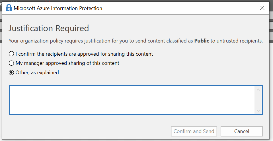 - to ask for justification (pre-defined or free text). The justification is added into the email header (msip_justification) to be available to other systems, like a data loss prevention (DLP)