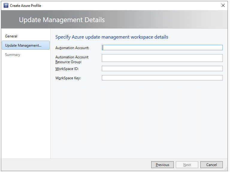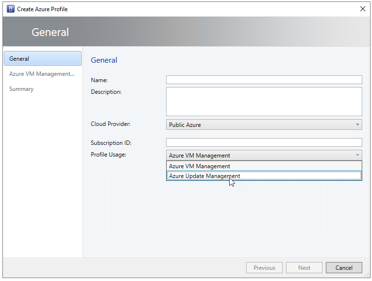 Then you name the profile, select the appropriate cloud provided (this should be – most of the time – Public Azure), the subscription ID and the profile usage will be set to Azure Update Management