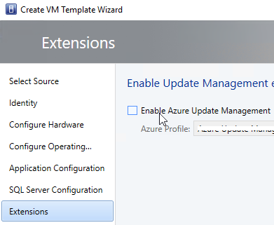 Once you have configured the Azure profile for update management, you can create/edit virtual machine template to enable the use of Azure Update management option available in the Extensions