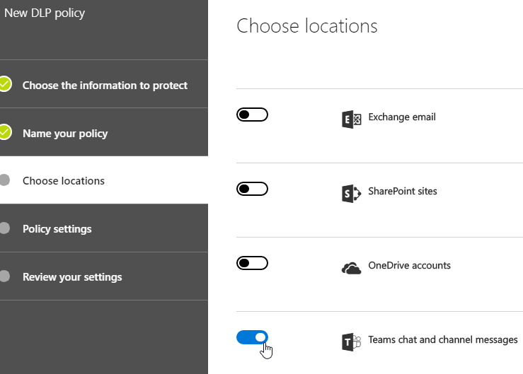 The data loss prevention (DLP) on Office 365 has been updated to allow you enable DLP for Microsoft Teams Chat and Channels.