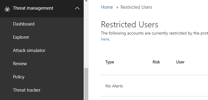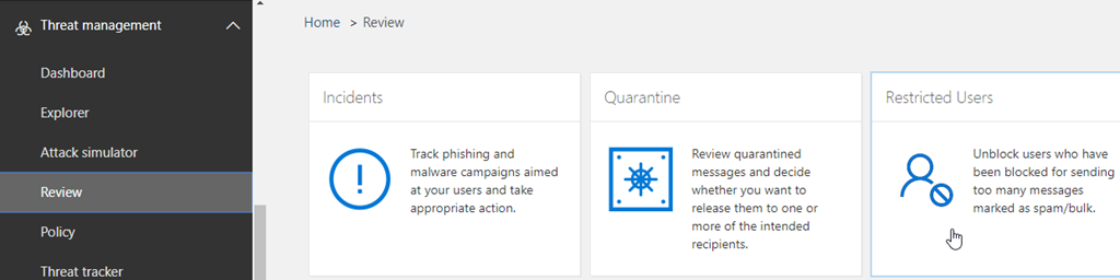 In addition of this move, administrators have now the ability to unblock such users from the SCC portal from the Threat Management\Review section by accessing the Restricted Users option (or access directly using the URL https://protection.office.com/#/restrictedusers)