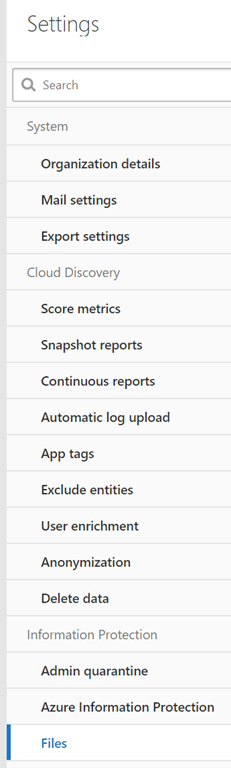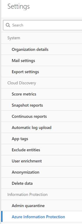 Access your MCAS portal (https://portal.cloudappsecurity.com) and go the Settings and reach the Information Protection\Azure Information Protection blade or just use the direct URL https://portal.cloudappsecurity.com/#/settings/?section=securityConnectors