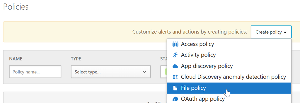 Still from the MCAS portal, access the Control\Policies blade and create a new File Policy