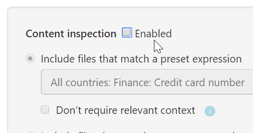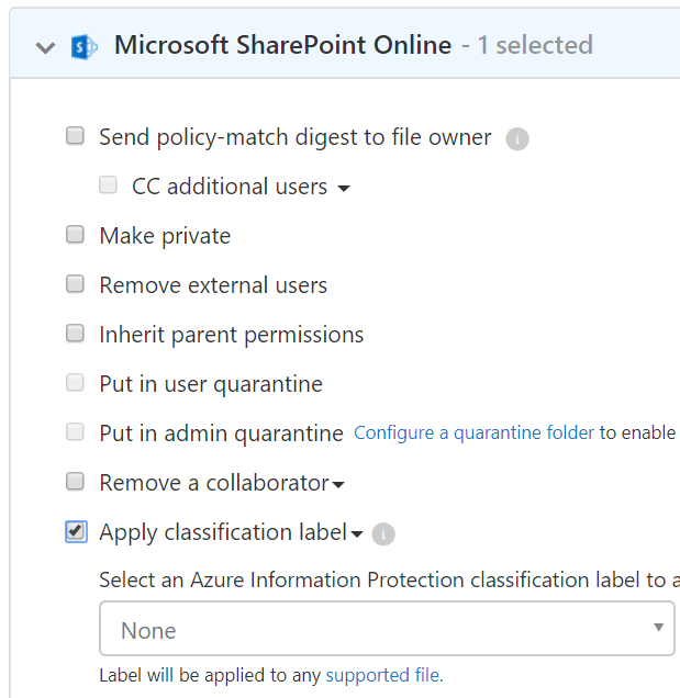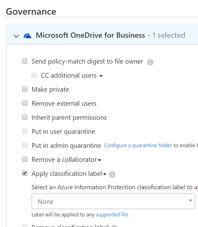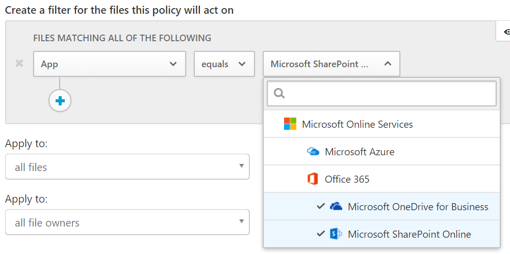 Select App then equal and select Microsoft OneDrive for Business and Microsoft SharePoint Online and enable content inspection to define content filtering, with the Inspect protected files option enabled and you can then define the AIP label to be applied in the Governance section