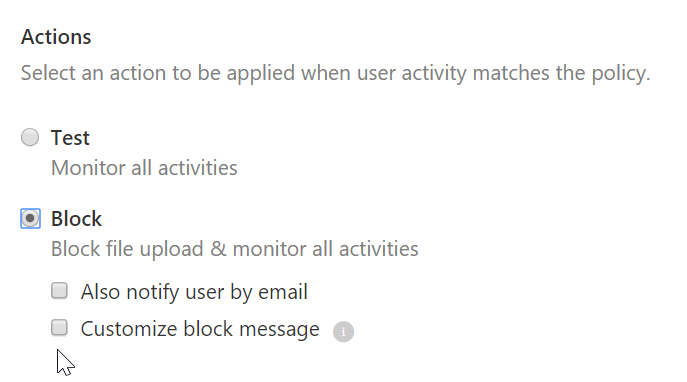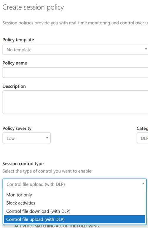 Name the policy and select Control file download (with DLP) or Control file upload (with DLP) for the Session Control Type and choose Block as Action
