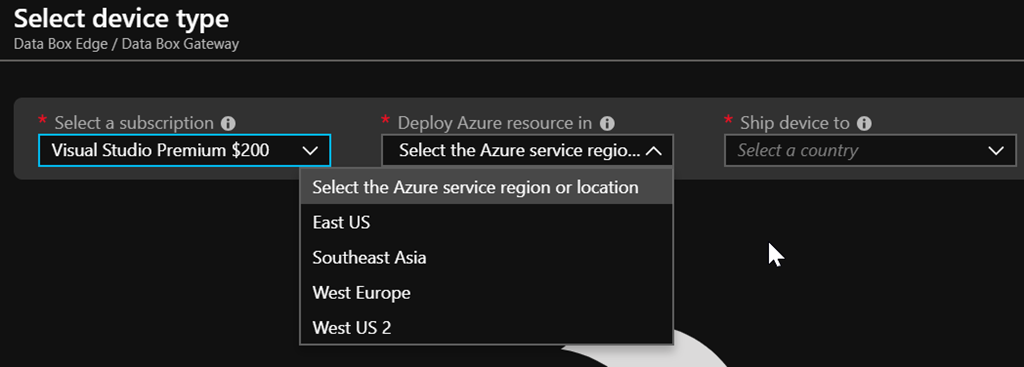 Then add a new device and select the Azure region where to deploy it and the location to ship your unit – I hope this will change a bit as there no device to ship for the Data Box Gateway. You can select any location for the shipping to then be able to download the virtualized appliance
