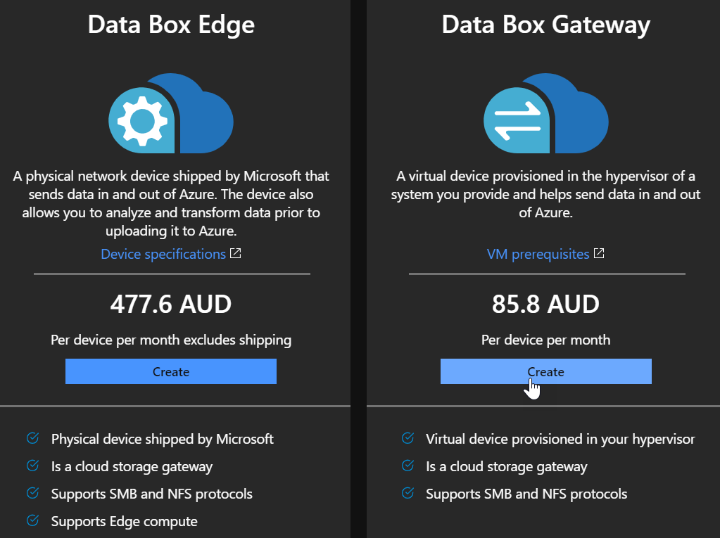 Then select Create for the Data Box Gateway
