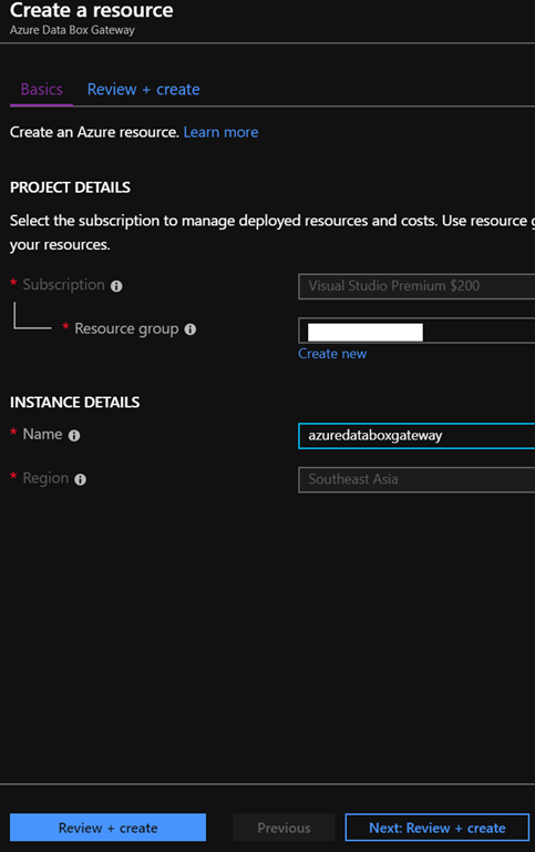 Fill up the few fields (resource group and instance name) to provision the gateway