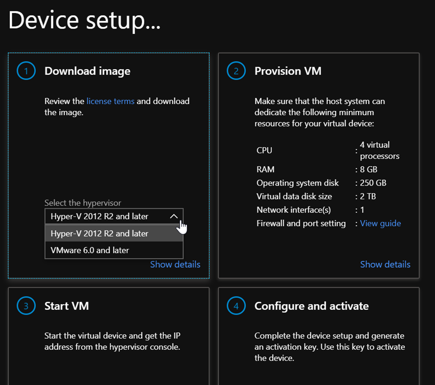 Then select the hypervisor you use, provision and start the virtual machine in your environment and generate an activation key