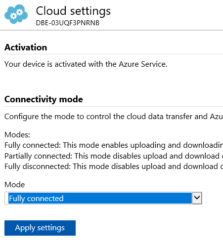 Once activated you will then be able to define the connectivity type – fully connected or partially connected – to help you manage the data synchronization as well as how the Data Box Gateway can be managed; can be useful if you don’t want your Azure administrator changing settings on your box. On the Azure portal, you will see your device has been successfully activated and ready for use