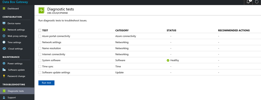 I’m not going to go through all the settings available in the Data Box portal as they are quite self explanatory. The only one which is going to be really useful is the Diagnostic tests one to help you in troubleshooting issues with your Data Box Gateway