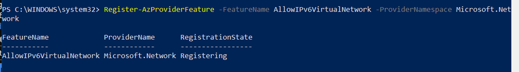 Register-AzProviderFeature -FeatureName AllowIPv6VirtualNetwork -ProviderNamespace Microsoft.Network