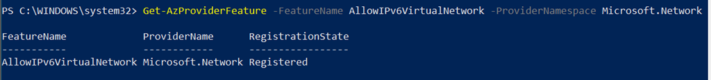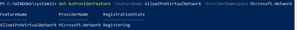 Get-AzProviderFeature -FeatureName AllowIPv6VirtualNetwork -ProviderNamespace Microsoft.Network