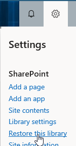 To restore a SharePoint library (without the need of administrator action), just go the library you suspect has been corrupted and want to recover and open the Gear menu to choose Restore this library