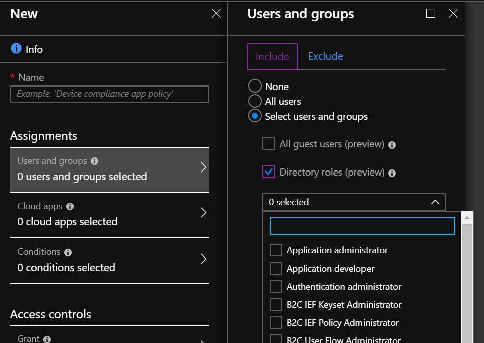 Now, you can apply the conditional access policy by using the Directory Roles to target the set of users – for both include and exclude (in preview)