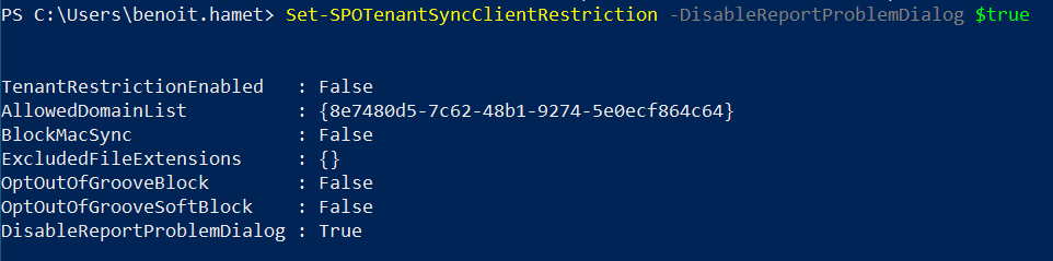 Set-SPOTenantSyncClientRestriction -DisableReportProblemDialog $true