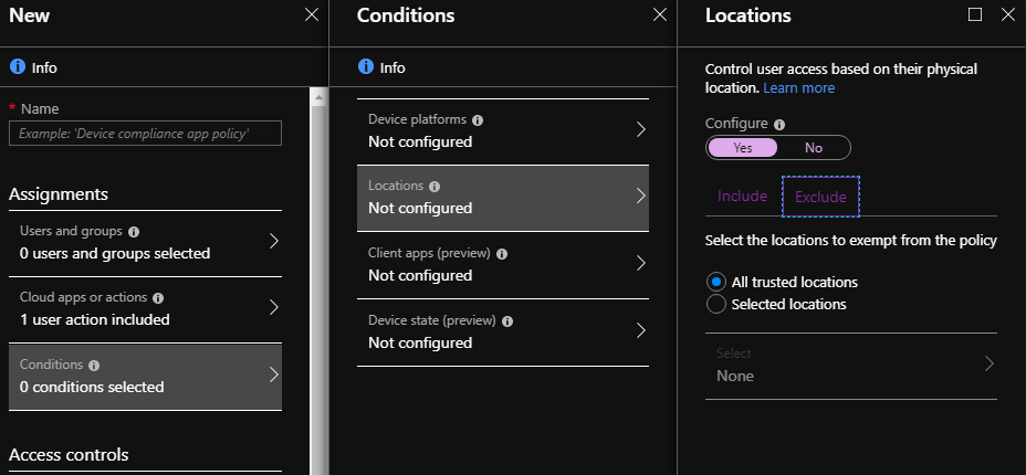 - Conditions: Locations\Include all location – Exclude All trusted locations – reminder the trusted locations refer to your public IP endpoint when you access Internet from your corporate network, this can be defined in the Conditional Access\Named Locations configuration blade
