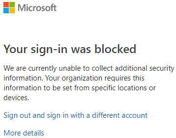 With this configuration users trying to register for MFA and/or SSPR must be within your corporate network. If they try to register from another network (cyber cafe, home…) they will get the below error message telling them they can not register because they are not connected to a trusted network.
