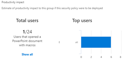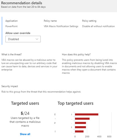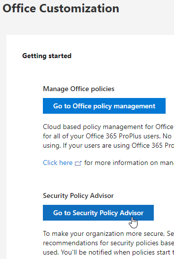 The Security Policy Advisor is providing recommendations to help improve and increase security of your Office 365 ProPlus deployment to protect you against threats and provide insights on impact of deploying policies.