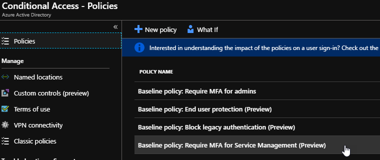 - Baseline policy: Require MFA for Service Management, will require MFA for all service management access (administration portal, PowerShell, Azure Cli)