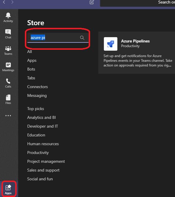 To do so, add the Azure Pipelines application in your Teams by accessing the Teams app catalog and search for Azure Pipelines (or Azure, or Pipelines) – you can also browse the Productivity category