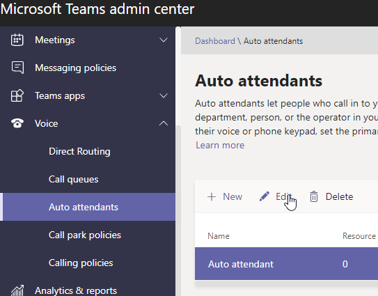 If you want to link it with an auto-attendant, reach out the Voice\auto attendant after you have set your organization holiday and then select the auto attendant you want to set for the holidays period and click Edit