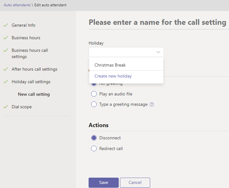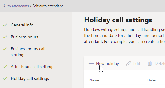 Then reach the auto attendant Holiday call settings and click the New Holiday
