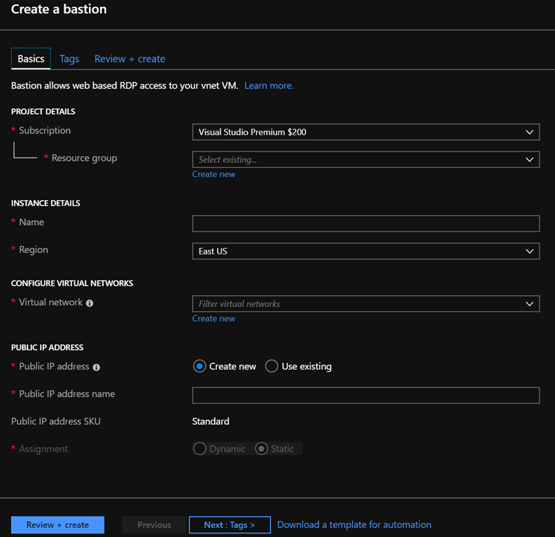 The creation process is requesting the usual settings (subscription, location), you will have to create a public IP (standard) and select the virtual network on which you have created the AzureBastionSubnet subnet