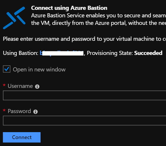 When using Bastion, you will then be asked to enter your credentials and have the option to use the remote access in a new browser window. Don’t forget turn off pop-up blocker or allow Azure portal to open a new pop-up